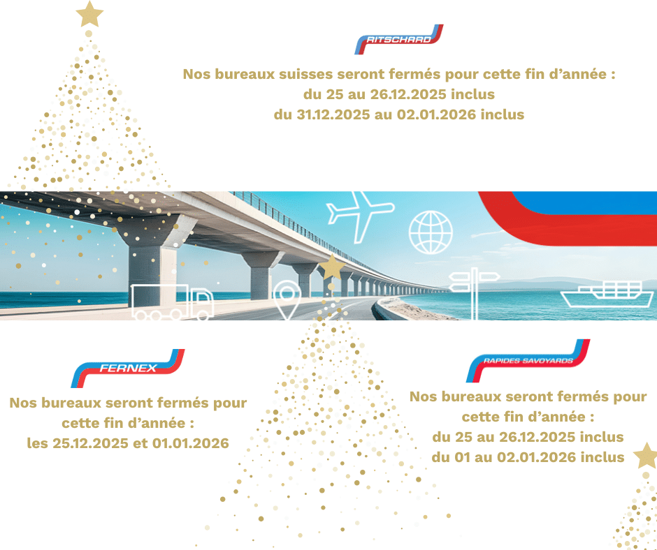 Pour mieux organiser votre logistique et vos transports, nous vous transmettons d’ores et déjà nos jours de fermeture de fin d’année, par entité du Groupe Ritschard. A savoir que nos bureaux ferment en fonction des fermetures des douanes suisses et françaises. Les équipes de Ritschard Suisse, Rapides Savoyards France et Fernex France vous accompagneront pendant cette période de Fêtes.