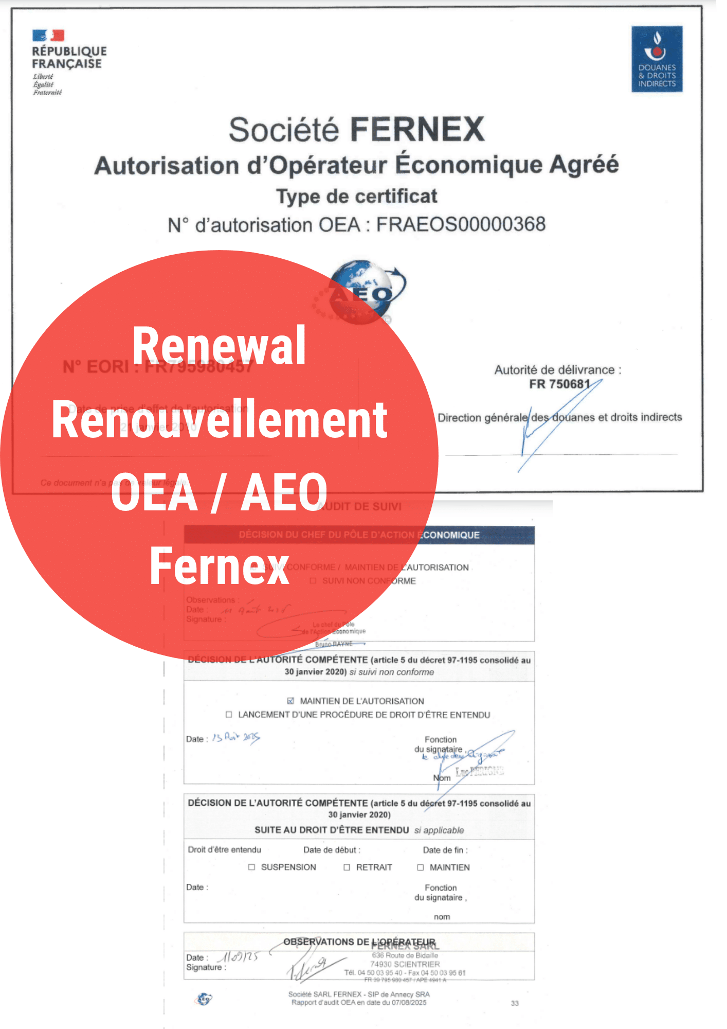 RENOUVELLEMENT AGRÉMENT OEA DE NOTRE FILIALE FRANÇAISE FERNEX